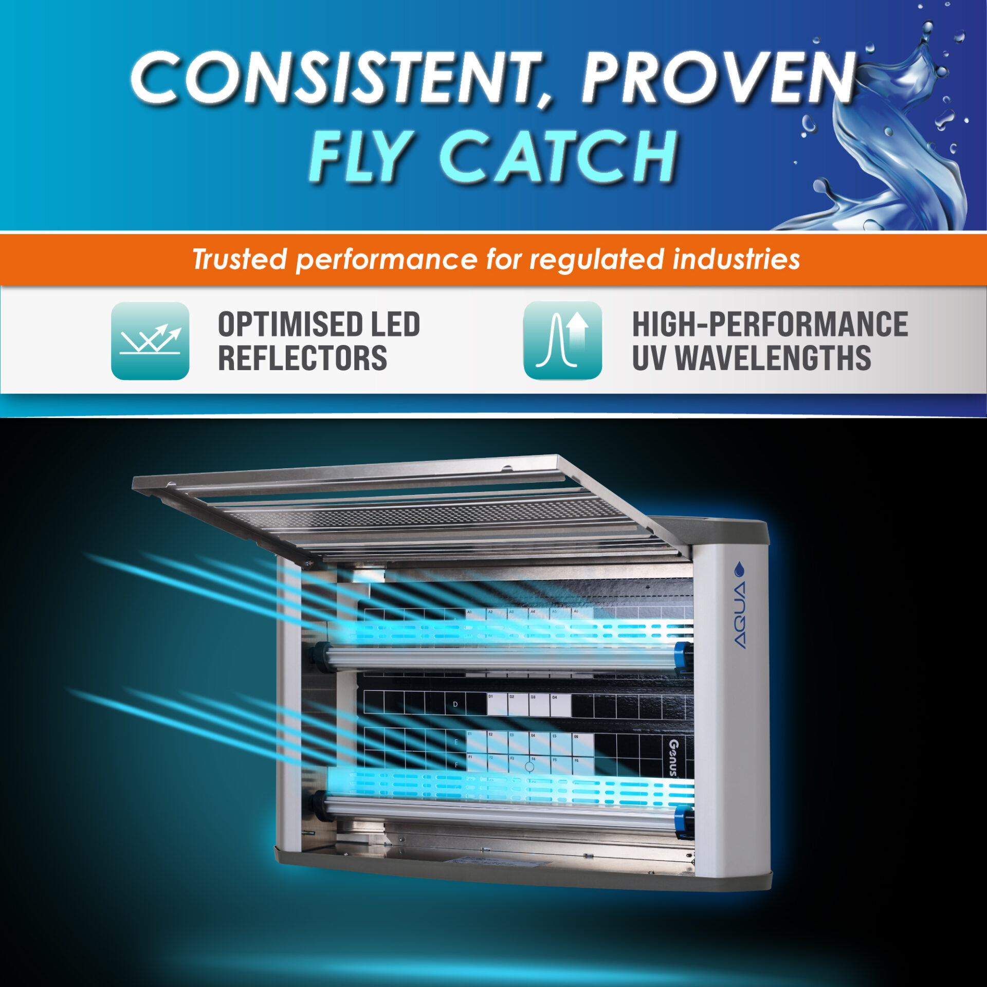 The Halo 30 LED Aqua extends the trusted Halo range into wet, humid, and washdown environments. Built with an IP65-rated housing, sealed LED UV lamps, and a hardwired power connection, it delivers dependable performance where standard units cannot. Tool-free servicing, a top-hinged front cover, and a side-entry glue board make maintenance quick and straightforward. Combining sustainability and durability, the Halo 30 LED Aqua ensures consistent fly control and compliance in hygiene-critical areas such as food production, healthcare, and pharmaceutical facilities. Reliable, efficient, and easy to maintain.