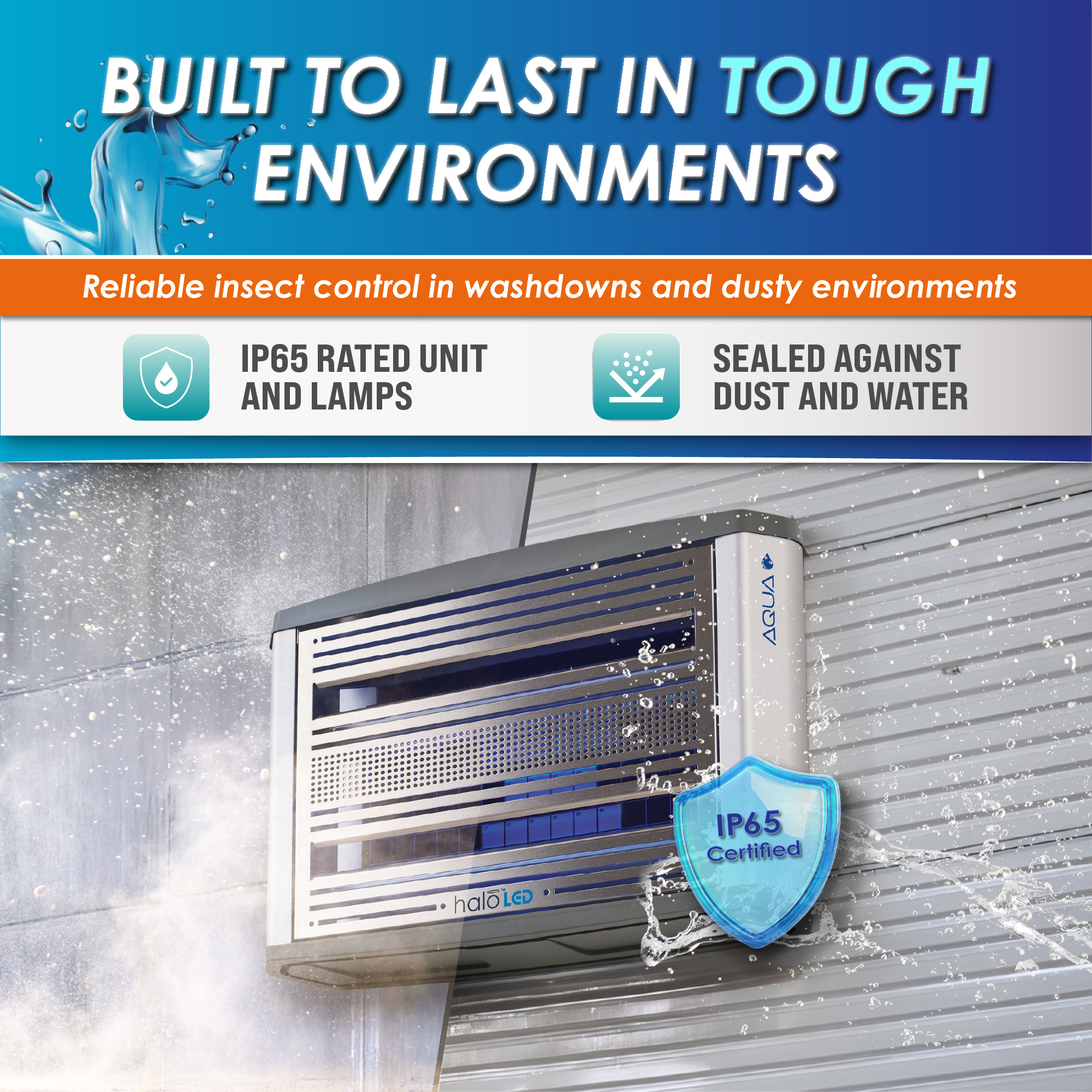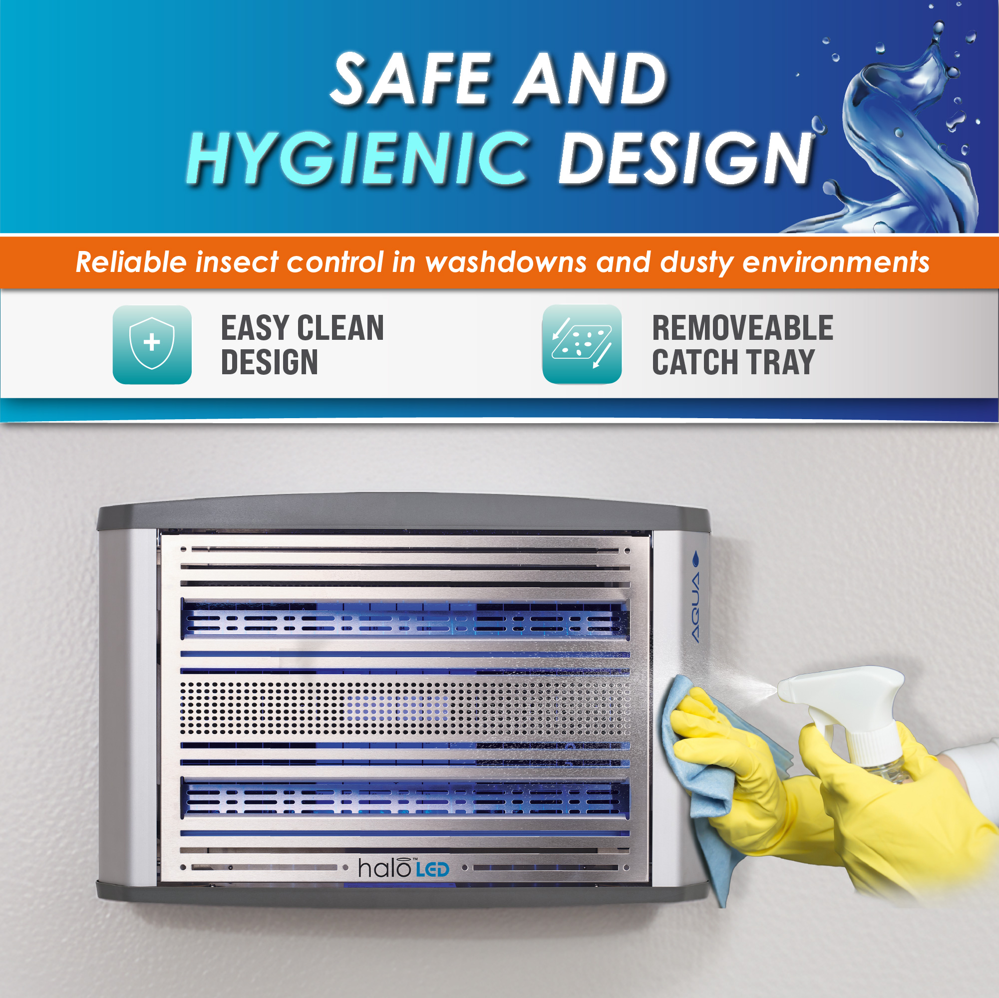 The Halo 30 LED Aqua extends the trusted Halo range into wet, humid, and washdown environments. Built with an IP65-rated housing, sealed LED UV lamps, and a hardwired power connection, it delivers dependable performance where standard units cannot. Tool-free servicing, a top-hinged front cover, and a side-entry glue board make maintenance quick and straightforward. Combining sustainability and durability, the Halo 30 LED Aqua ensures consistent fly control and compliance in hygiene-critical areas such as food production, healthcare, and pharmaceutical facilities. Reliable, efficient, and easy to maintain.