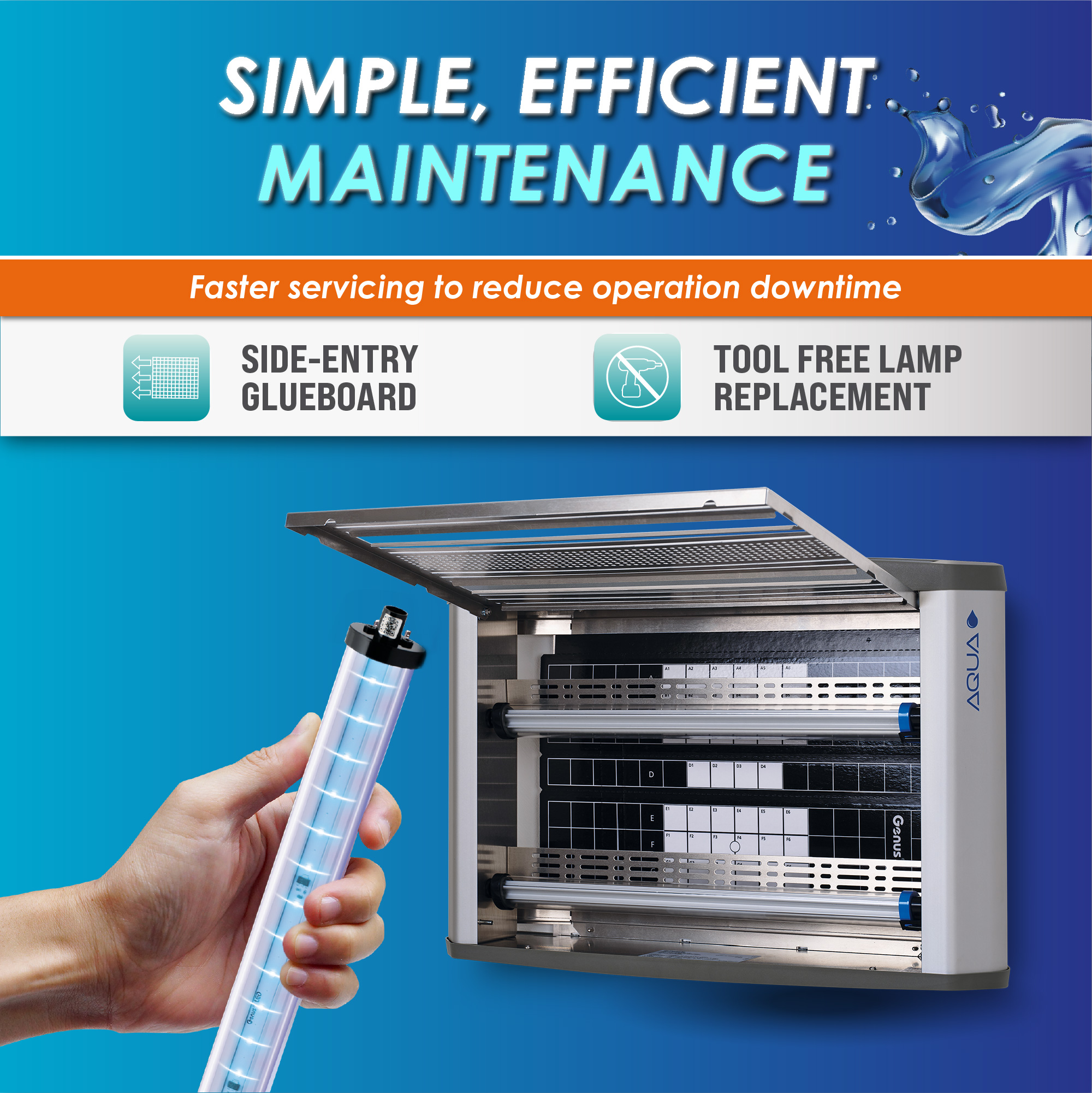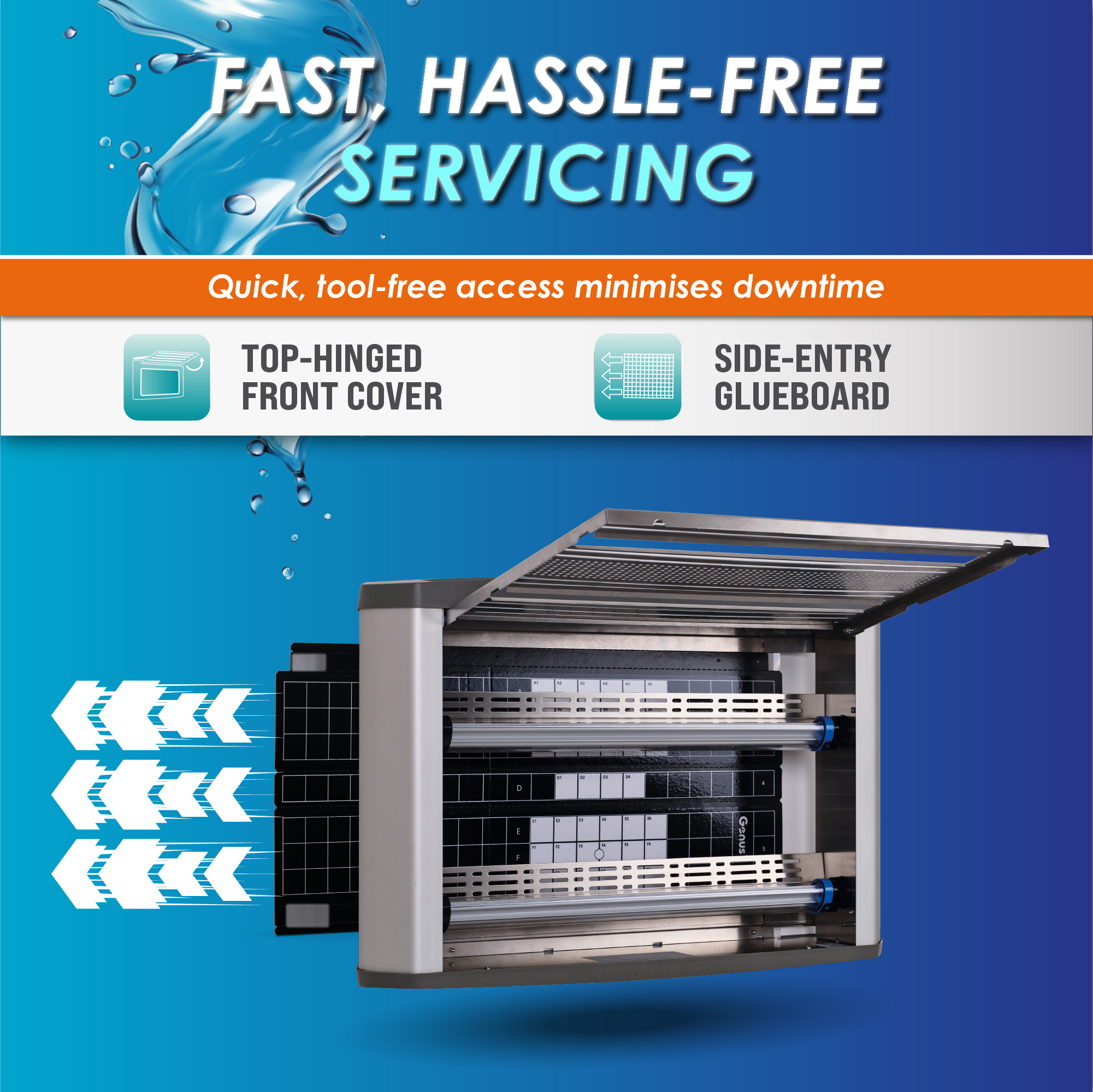 - Side-Entry Glue Board: Allows fast, hygienic replacement without removing or opening major components.